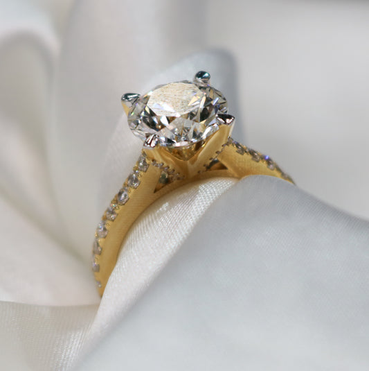 3.05 Carat Round Brilliant Lab Grown Diamond in 18k Yellow Gold Pave Cathedral Setting