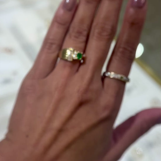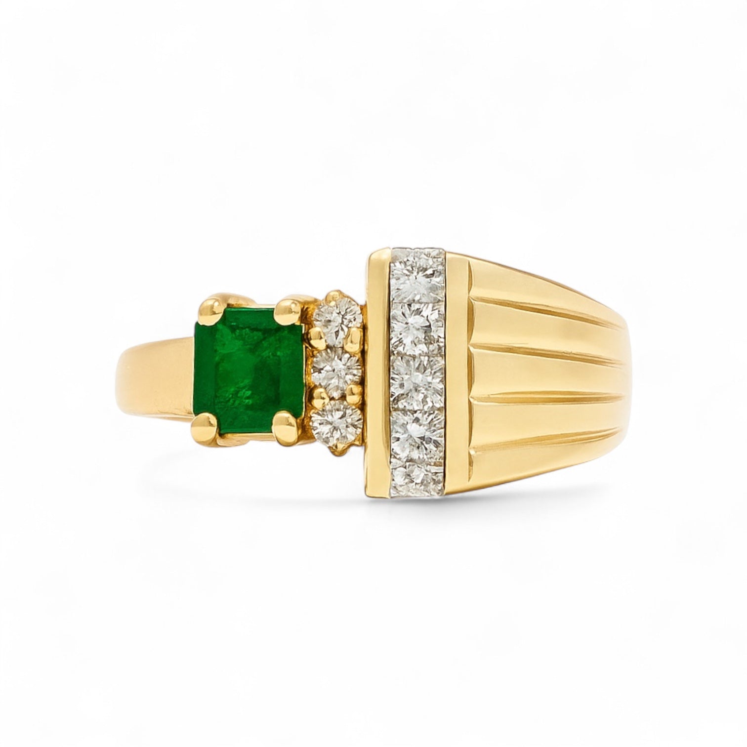 Striking in silhouette and opulent in detail, this 14k gold ring is a bold expression of refinement. A richly saturated, square-cut natural emerald takes center stage—its vivid green hue a symbol of vitality and elegance. Flanked by a trio of brilliant natural diamonds on one side and a vertical channel of pavé-set diamonds on the other, the ring creates a striking contrast of symmetry and asymmetry.