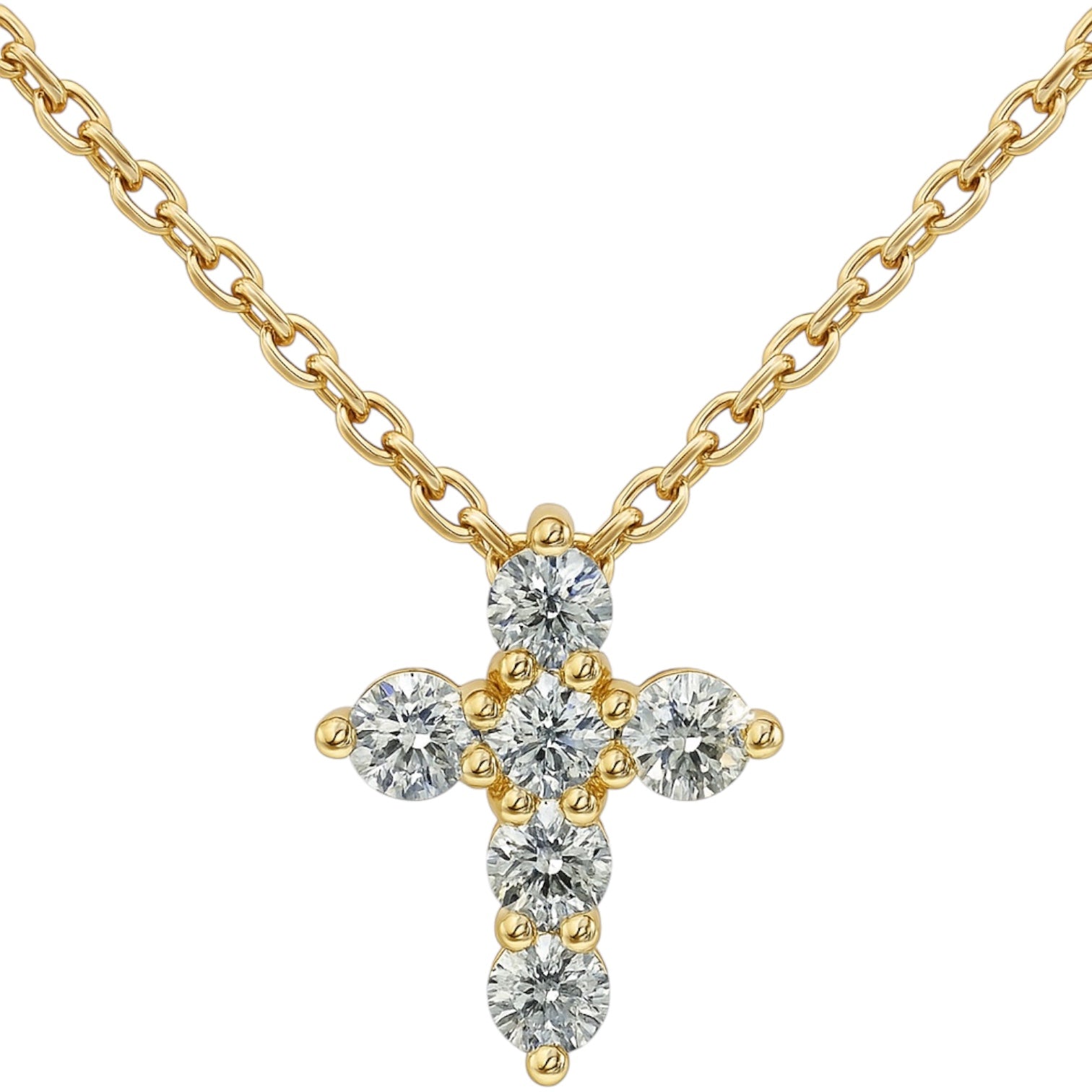 This petite cross necklace features 0.60 carats of round brilliant lab-grown diamonds, delicately set in a timeless silhouette. Measuring 1.5 cm in height and 1 cm in width, the cross pendant is crafted in solid 14k gold and suspended from a classic 16-inch chain—an everyday expression of faith, love, or personal meaning.