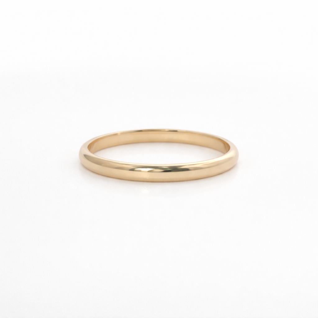 This 14k gold band features a slim 2mm profile designed for understated elegance and everyday wear. Its polished finish and classic silhouette make it perfect worn alone, stacked, or paired with an engagement ring. Timeless and versatile, this piece is a refined essential for any jewelry collection.