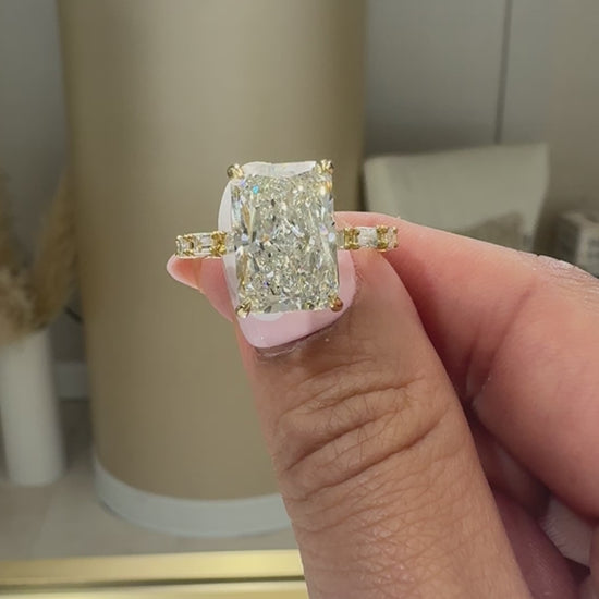 Set in rich 18k yellow gold, this striking 5.59 ct lab-grown radiant-cut diamond takes center stage with exceptional brilliance and bold presence. Graded G color, VS1 clarity, and Excellent cut, the center stone is a radiant showstopper from every angle.