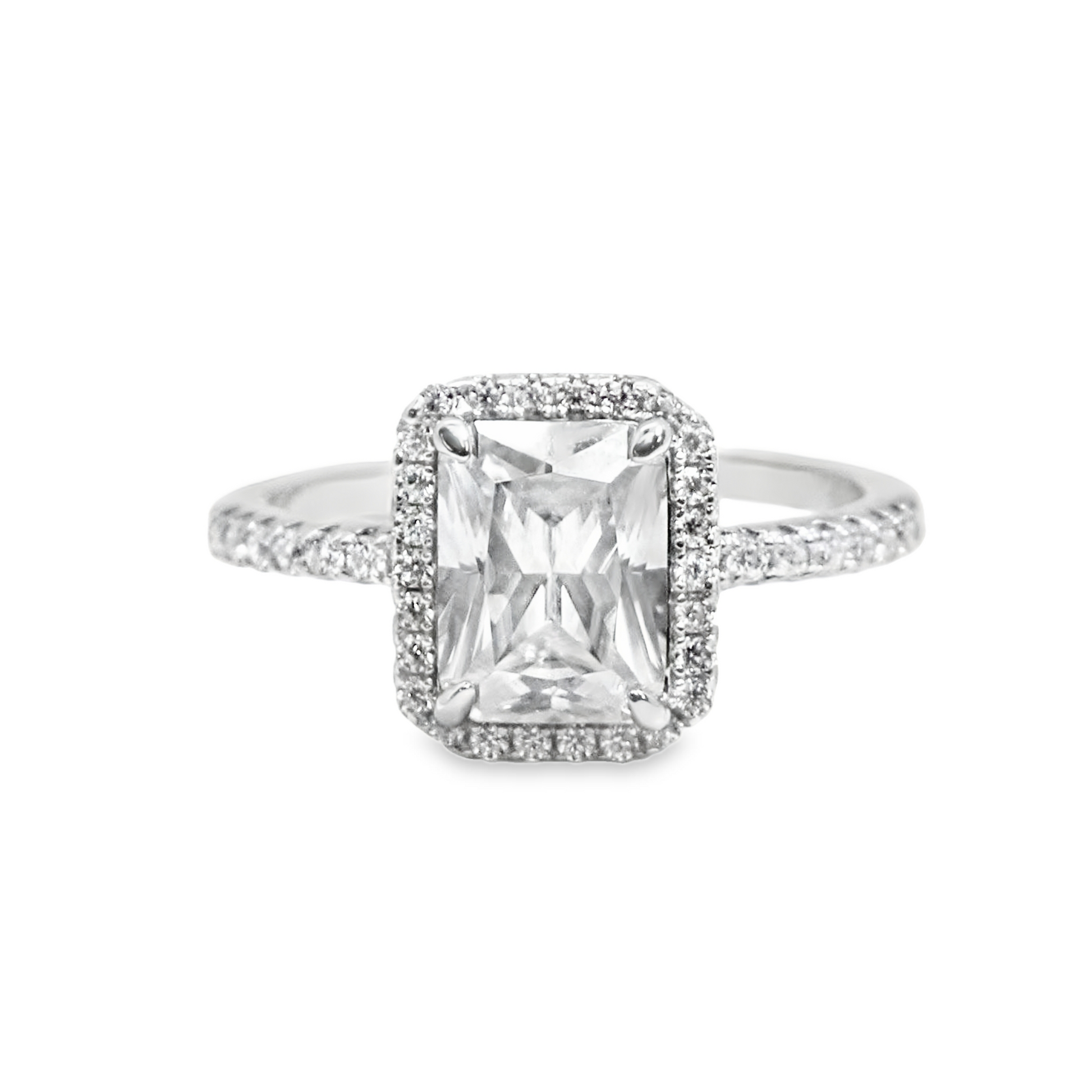 2.0ct Emerald Cut Moissanite Engagement Ring with Halo in Sterling Silver